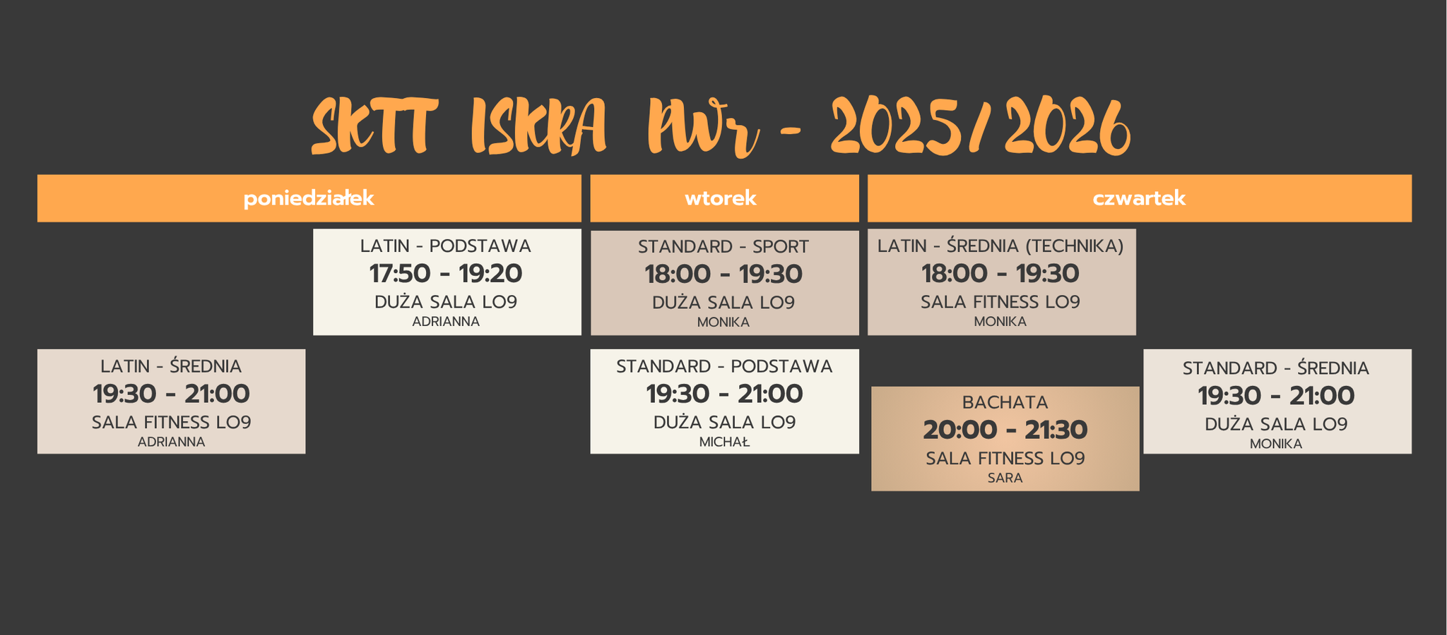 - 17:50 do 19:20 - łacina - taniec towarzyski - grupa podstawowa - LO9 - s. gimnastyczna - trenerka Ada